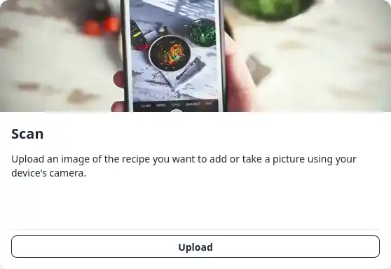 Vous pouvez télécharger une image ou un scan d’une recette manuscrite ou imprimée pour l’ajouter à votre collection. Cette option est utile pour numériser vos recettes papier et celles de votre famille.